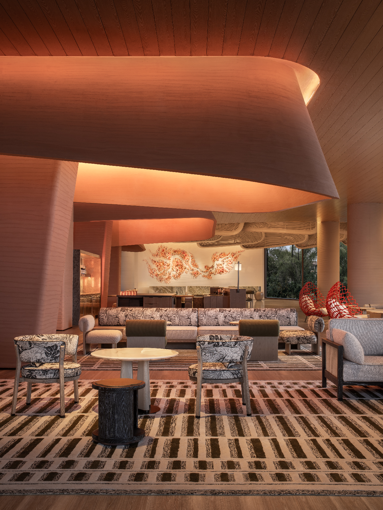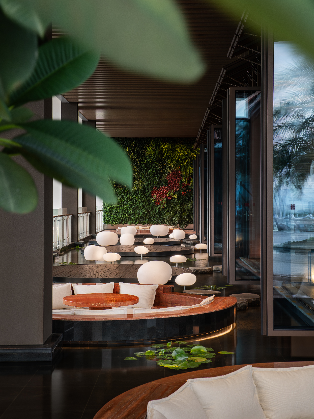 如何在华邑首家亲子度假酒店内,提升都市标准茶空间的度假感与自然连接是该举茗邑设计的重点,我们创造性内退建筑墙体约5米,构建半户外水庭院。下沉式围合沙发营造休闲聚落感,深褐色柚木平台延展空间,波光绿意成为天然背景。模糊室内外界限,最大化引入海天景观,塑造沉浸式「滨海度假茶叙体验」